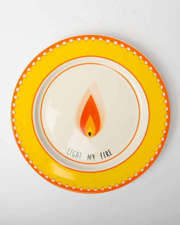 Colori energici e un’illustrazione a forma di fiamma rendono questo piatto vivace e luminoso. Perfetto per portare calore e personalità in tavola.