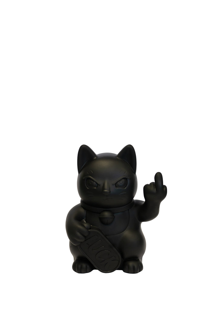 Queste statue reinterpretano il classico gesto beneaugurante con un tono satirico e ribelle: il gatto, con espressione agguerrita, mostra il dito medio, mantenendo però in una zampa la classica targhetta “LUCK”.
