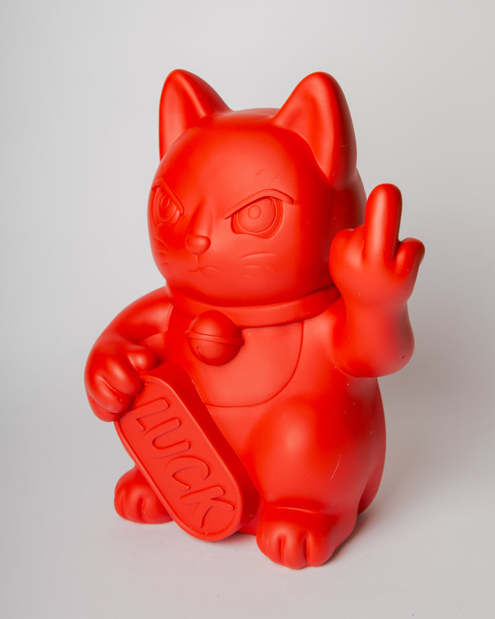 Queste statue reinterpretano il classico gesto beneaugurante con un tono satirico e ribelle: il gatto, con espressione agguerrita, mostra il dito medio, mantenendo però in una zampa la classica targhetta “LUCK”.