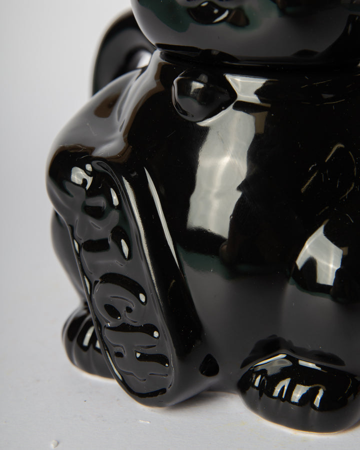 La collezione include anche teiere in ceramica smaltata dalla forma zoomorfa: un gatto stilizzato che, con uno sguardo felice e sereno, sorregge una targhetta “RICH” (ricchezza). La testa funge da tappo, mentre la zampa sollevata diventa un elegante beccuccio.