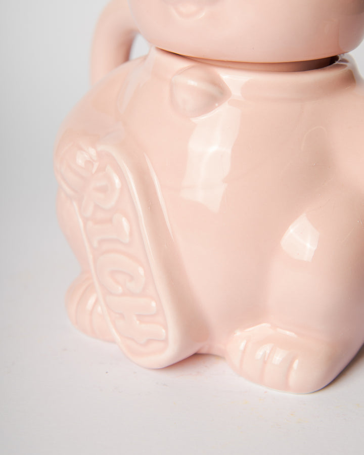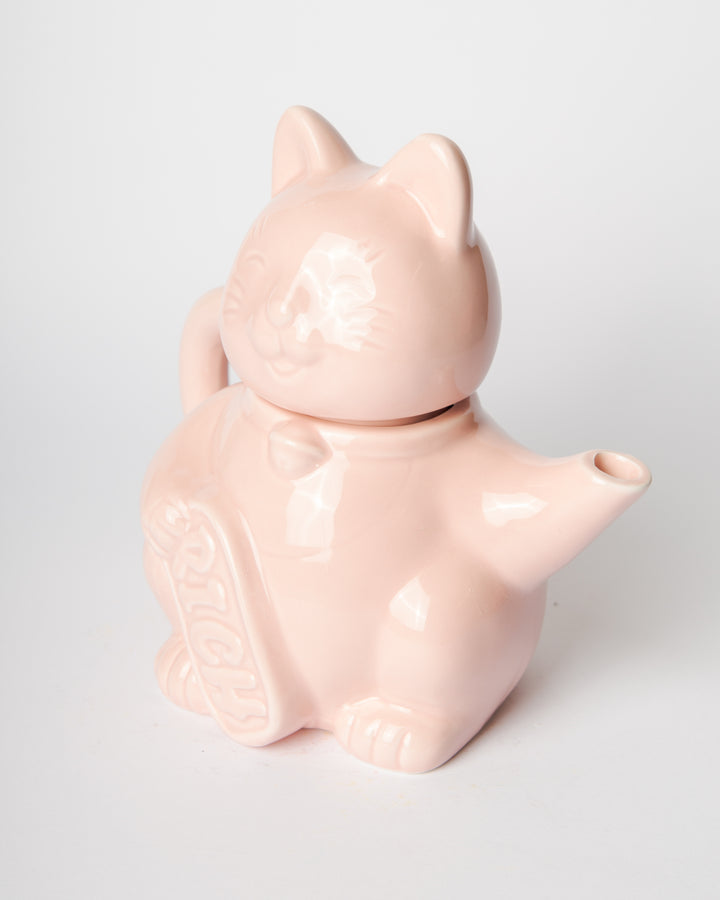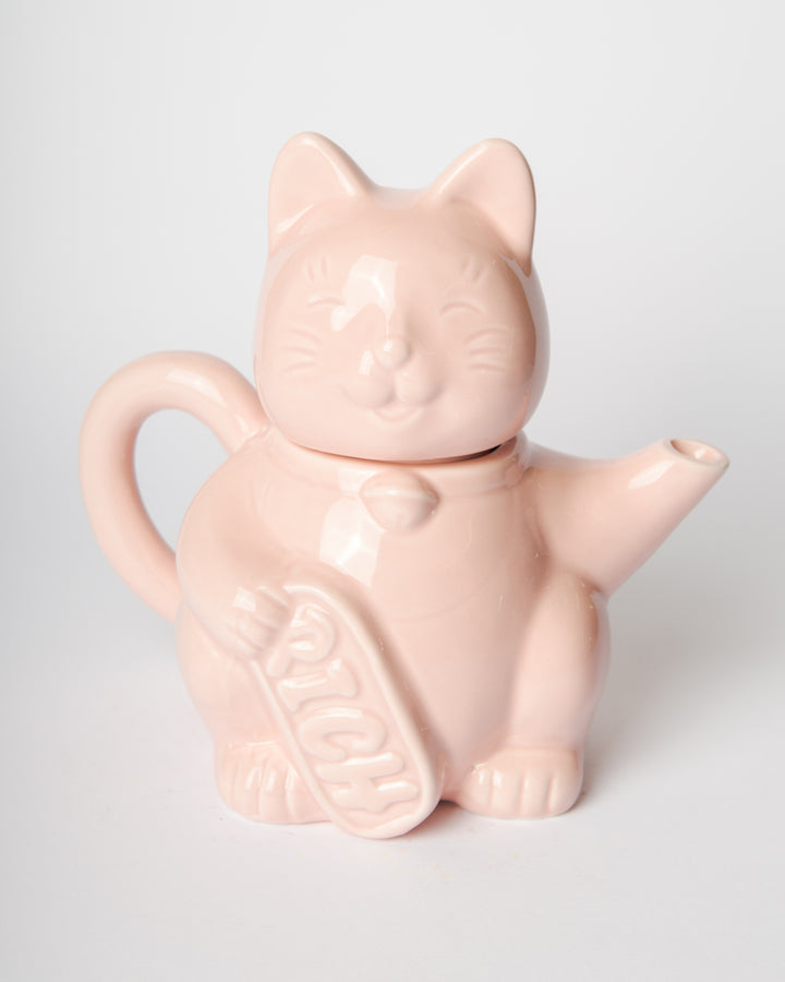 La collezione include anche teiere in ceramica smaltata dalla forma zoomorfa: un gatto stilizzato che, con uno sguardo felice e sereno, sorregge una targhetta “RICH” (ricchezza). La testa funge da tappo, mentre la zampa sollevata diventa un elegante beccuccio.