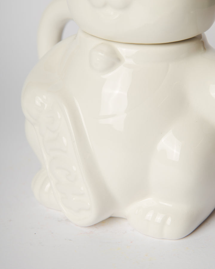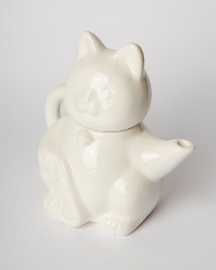 La collezione include anche teiere in ceramica smaltata dalla forma zoomorfa: un gatto stilizzato che, con uno sguardo felice e sereno, sorregge una targhetta “RICH” (ricchezza). La testa funge da tappo, mentre la zampa sollevata diventa un elegante beccuccio.