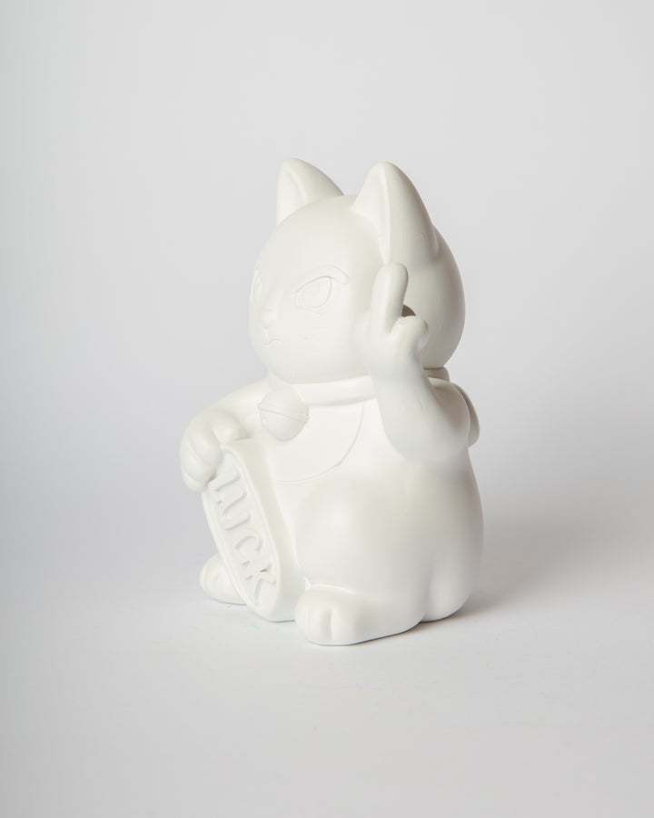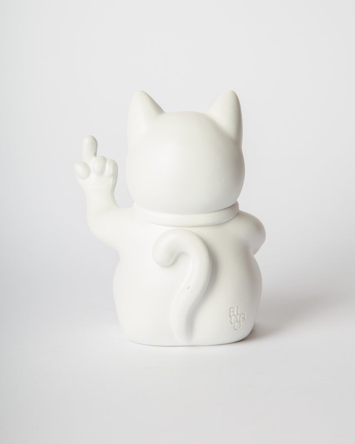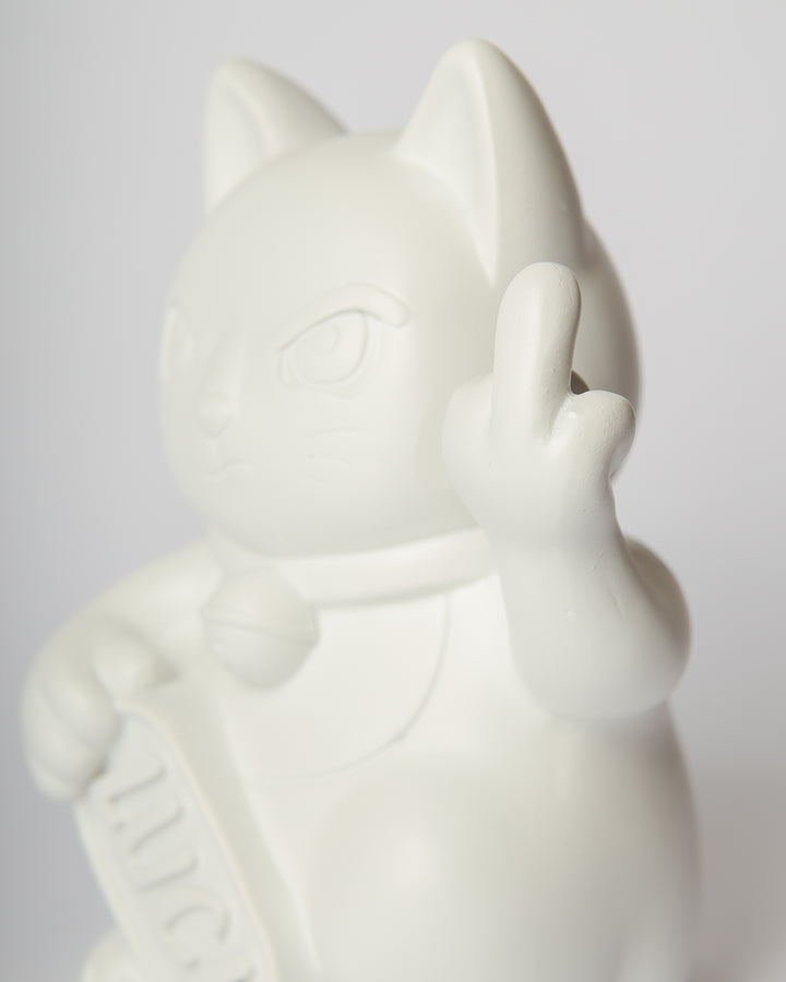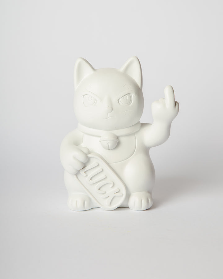 Queste statue reinterpretano il classico gesto beneaugurante con un tono satirico e ribelle: il gatto, con espressione agguerrita, mostra il dito medio, mantenendo però in una zampa la classica targhetta “LUCK”.