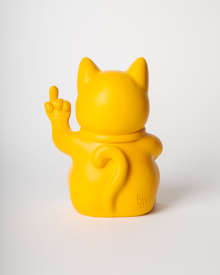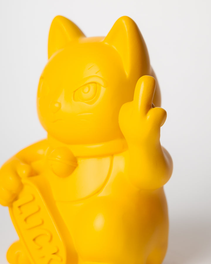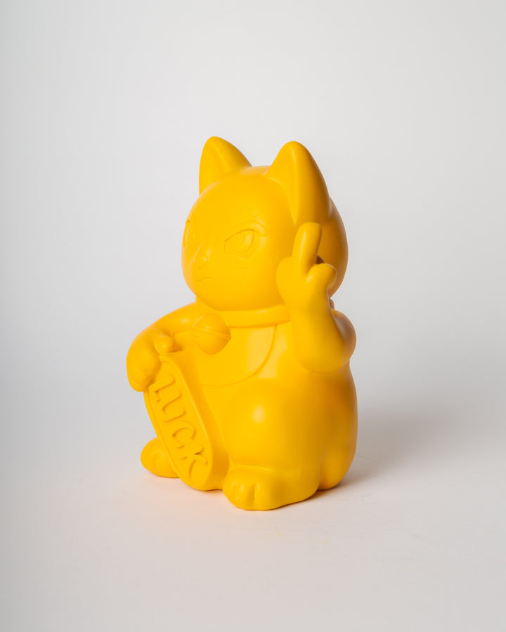 Queste statue reinterpretano il classico gesto beneaugurante con un tono satirico e ribelle: il gatto, con espressione agguerrita, mostra il dito medio, mantenendo però in una zampa la classica targhetta “LUCK”.